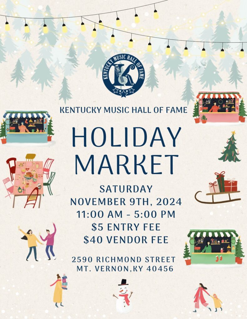 We are excited to announce our Annual Holiday Market inside the Kentucky Music Hall of Fame & Museum on Saturday, November 9th from 11AM to 5PM. Vendor applications are being