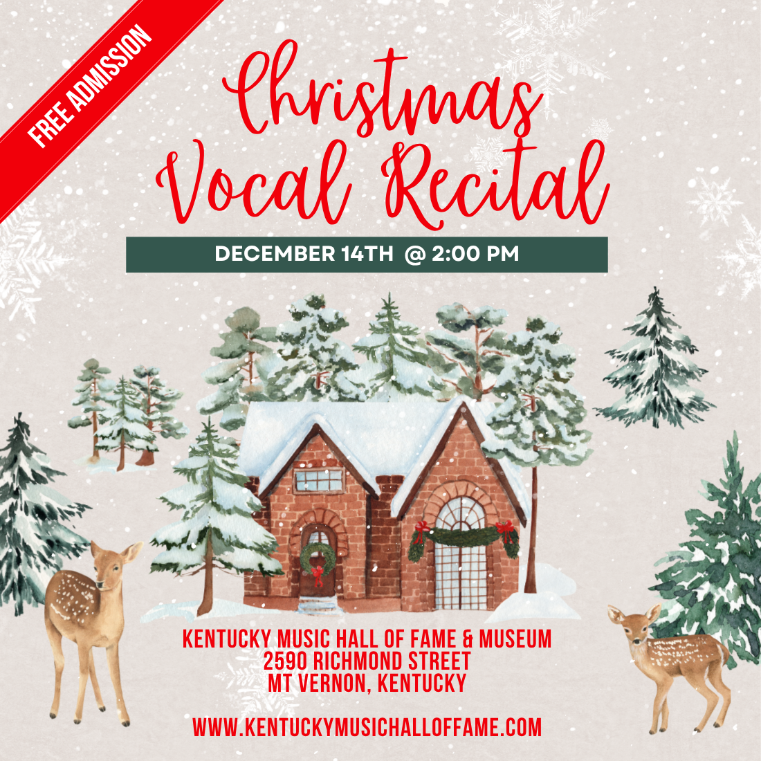 Join us as we celebrate the holiday season with our Studio London Vocal Student Christmas Recital at the Kentucky Music Hall of Fame! Enjoy selections of Christmas songs performed by our vocal students. Music kicks off at 2:00 PM in our lobby and is free to attend.